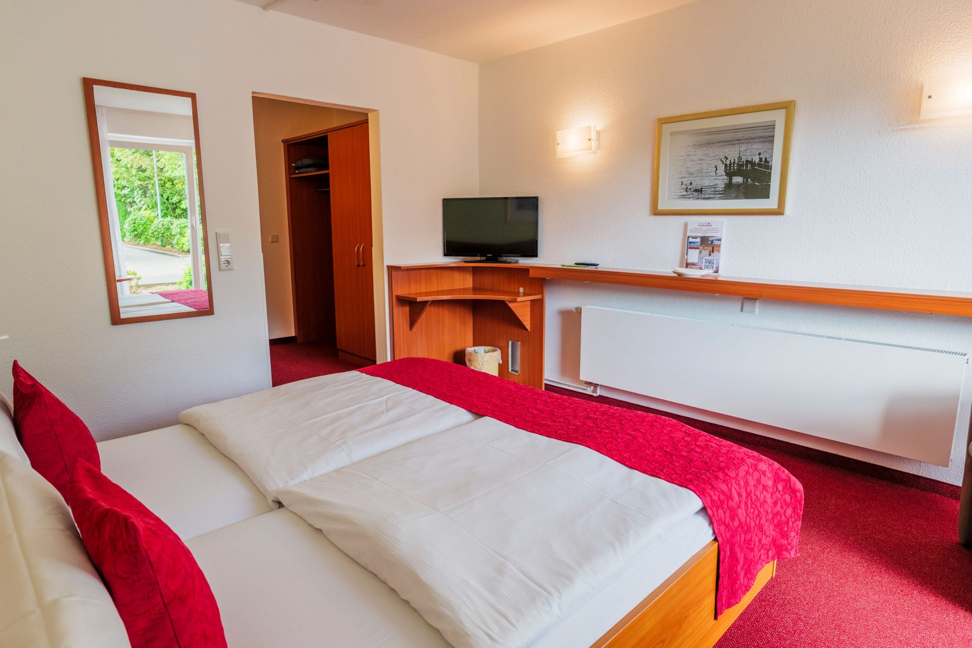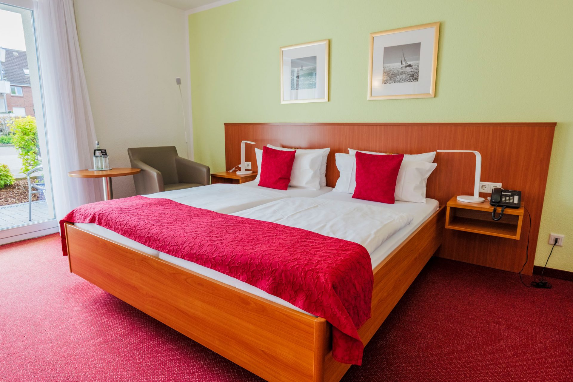 Das Doppelzimmer „Matrose“ ist ca. 26 m² groß und liegt im Erdgeschoss oder ersten Obergeschoss mit maritimem Ambiente. Zur Ausstattung gehören ein komfortables Doppelbett, Flachbild-TV, Telefon und kostenfreies WLAN. Vom Zimmer aus gelangen Sie auf Ihren eigenen Balkon oder Terrasse. Im modernen Bad finden Sie eine Dusche, WC und Föhn. Nichtraucherzimmer mit barrierefreiem Zugang per Aufzug. Das Zimmer ist auch als Einzelzimmer buchbar.